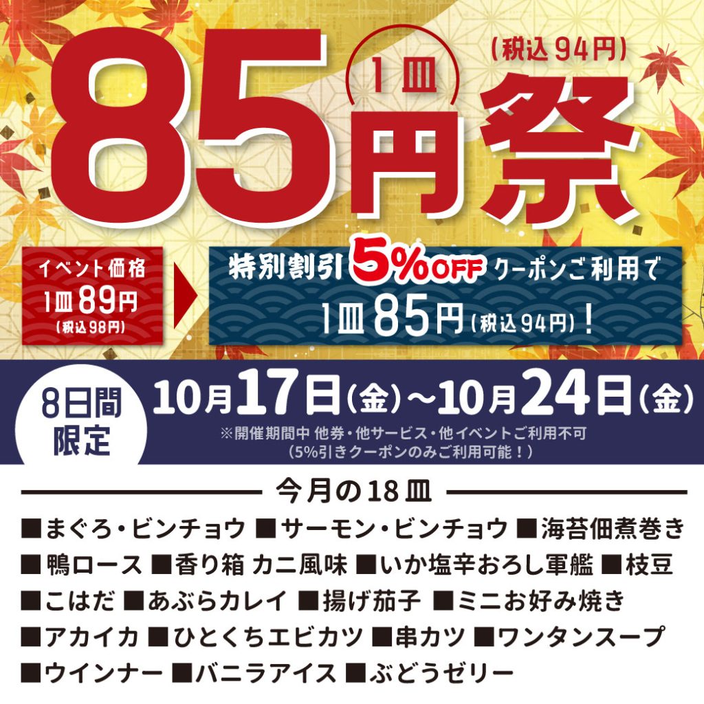 クーポンご利用で1皿85円!期間限定のお得なイベントです。