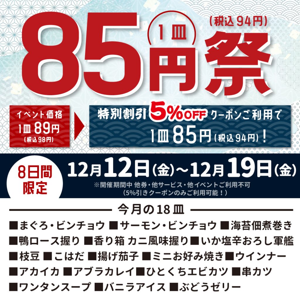クーポンご利用で1皿85円!期間限定のお得なイベントです。