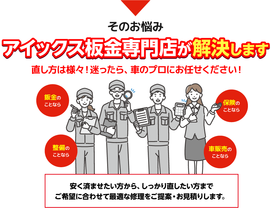 お客様に寄り添った親身なサービスを心がけ、板金修理のみならず愛車のオイル交換、車検、自動車保険、お車の買い替えについても対応しております。 愛車のキズヘコミ・板金塗装についてアイックス鈑金にお気軽にご相談ください。