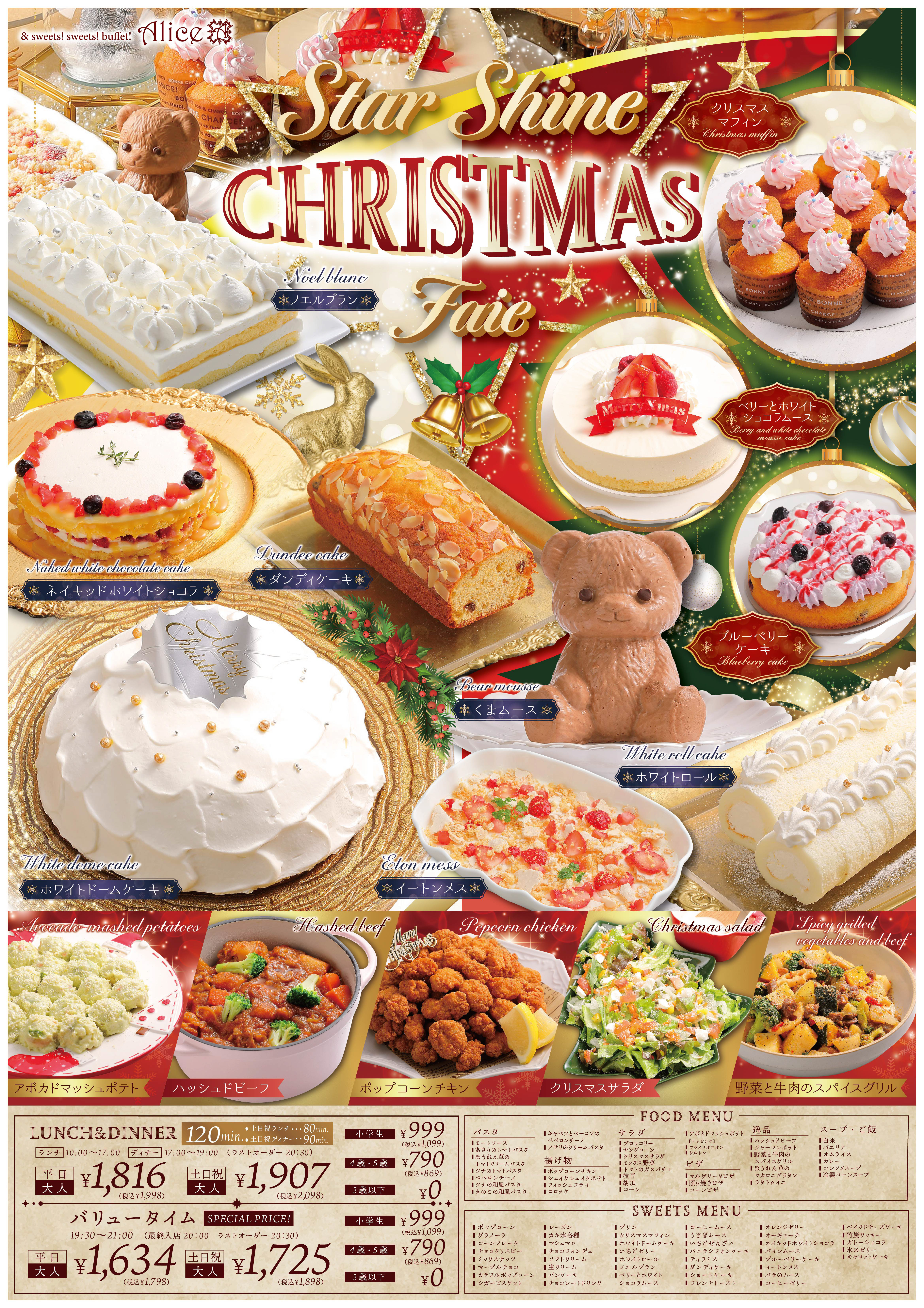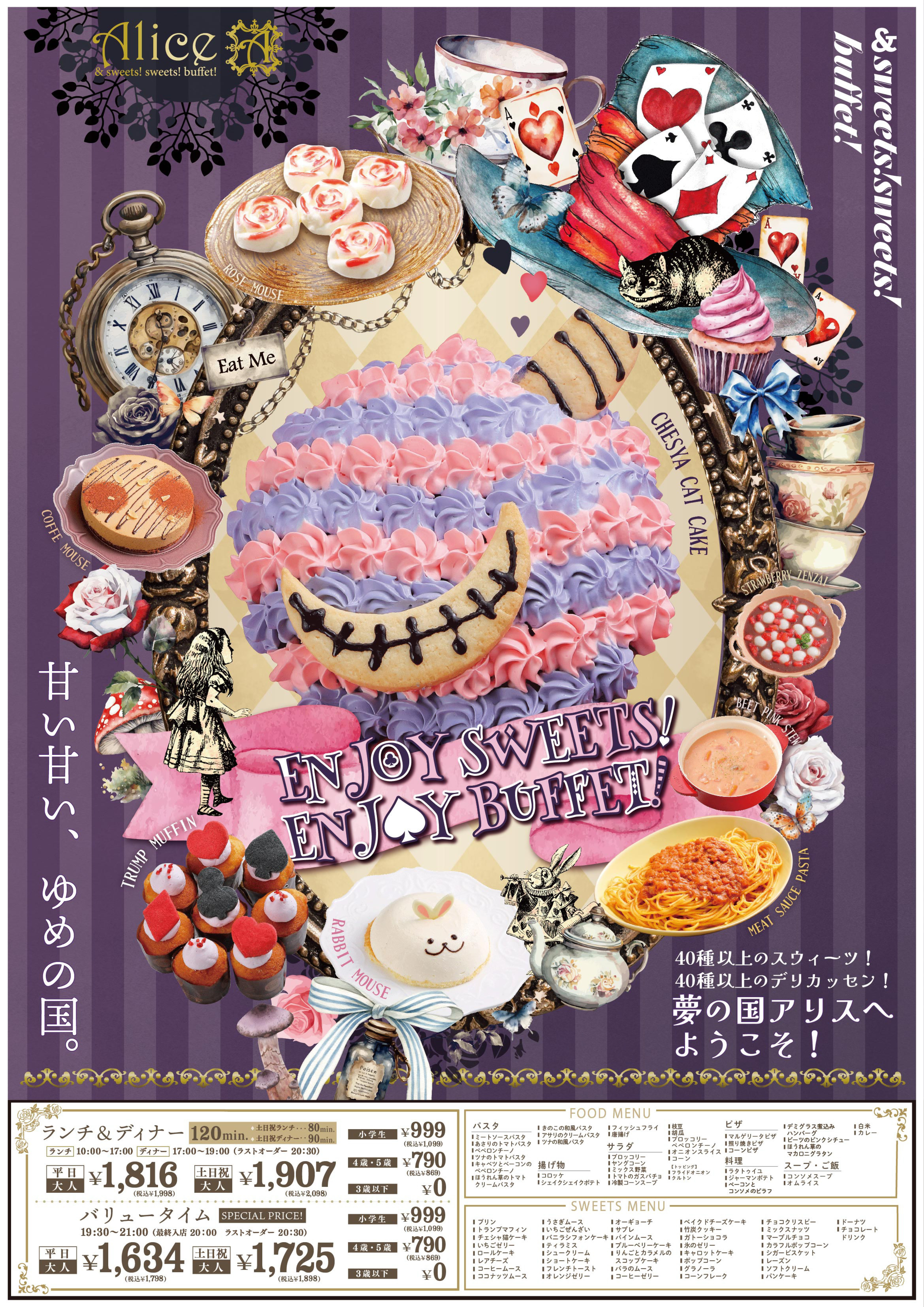 & sweets!sweets!buffet!アリスは「不思議の国のアリス」の世界をモチーフにした店内で、その場で焼いた出来立てスウィーツ、しっかりお食事を取りたい方も満足のサラダやデリを ビュッフェスタイルでご提供しています。